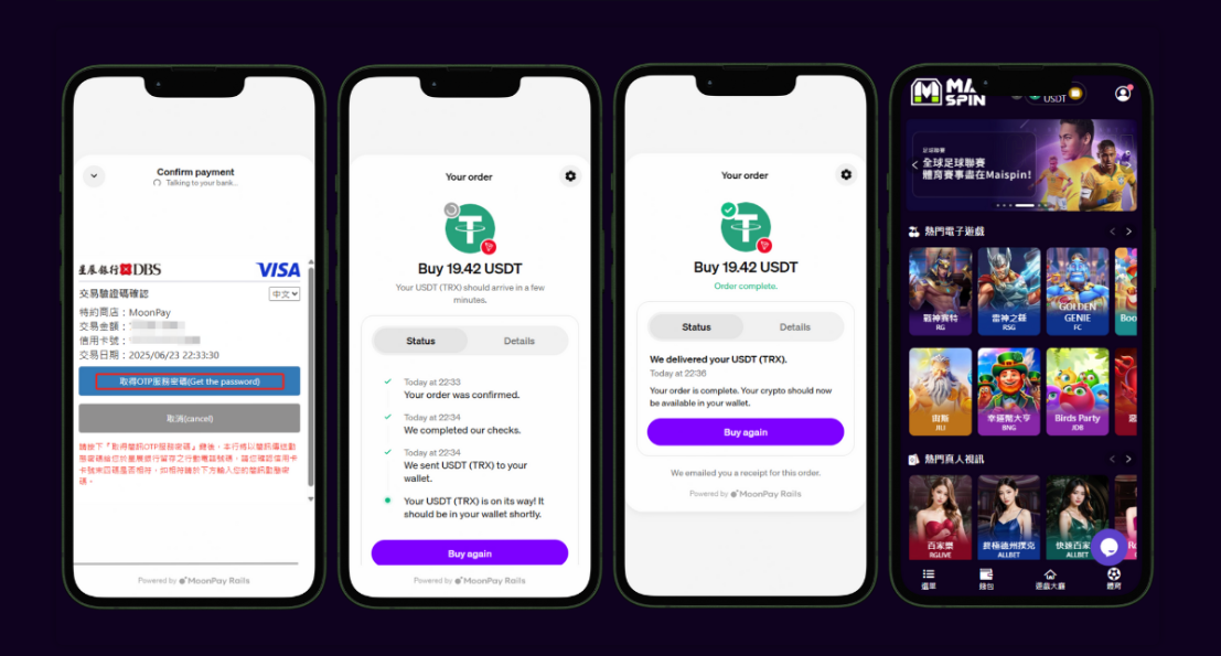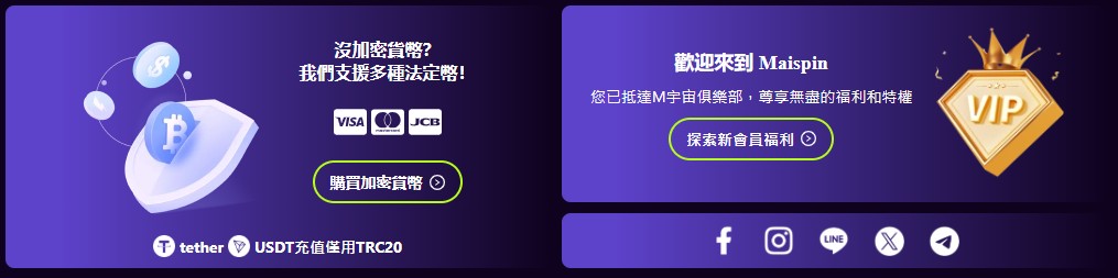 Maispin 專為加密貨幣玩家設計,所有存取款皆使用 USDT(Tether)交易,目前僅支援 USDT-TRC20,確保交易快速、安全、匿名,無需銀行帳戶即可輕鬆入金與提款。